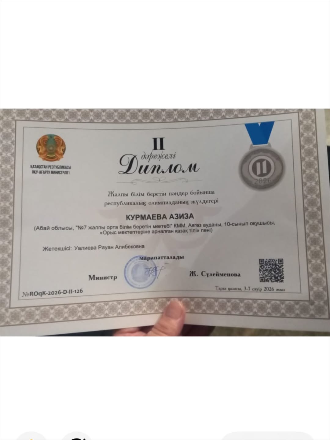 Азиза Құрмаеваны қазақ тілі мен әдебиеті бойынша республикалық олимпиадада 2-ші орын және күміс медаль жеңіп алғаны үшін құттықтаймыз!