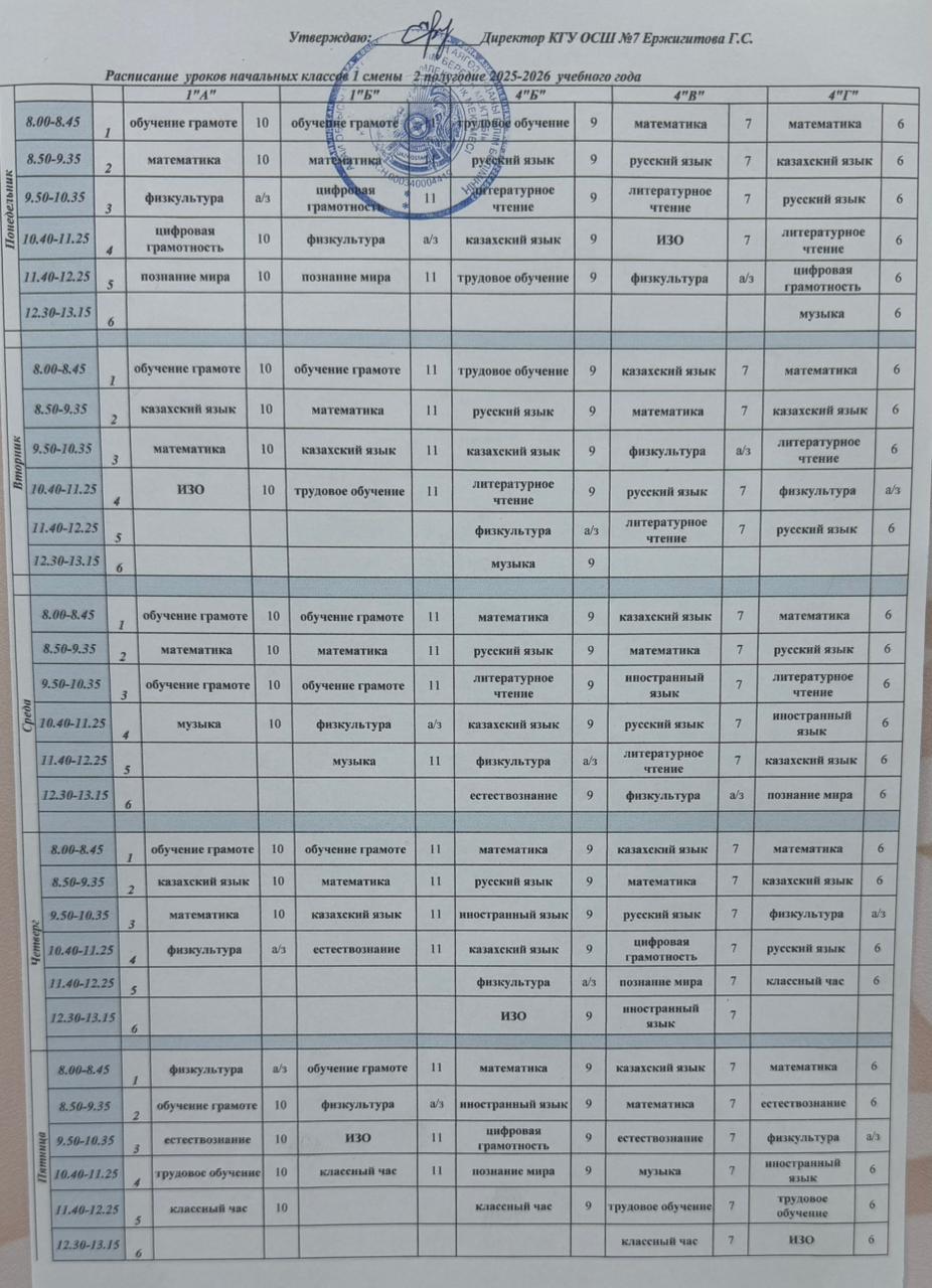 2025-2026 оқу жылының екінші жартыжылдығына арналған бастауыш сыныптардың сабақ кестесі