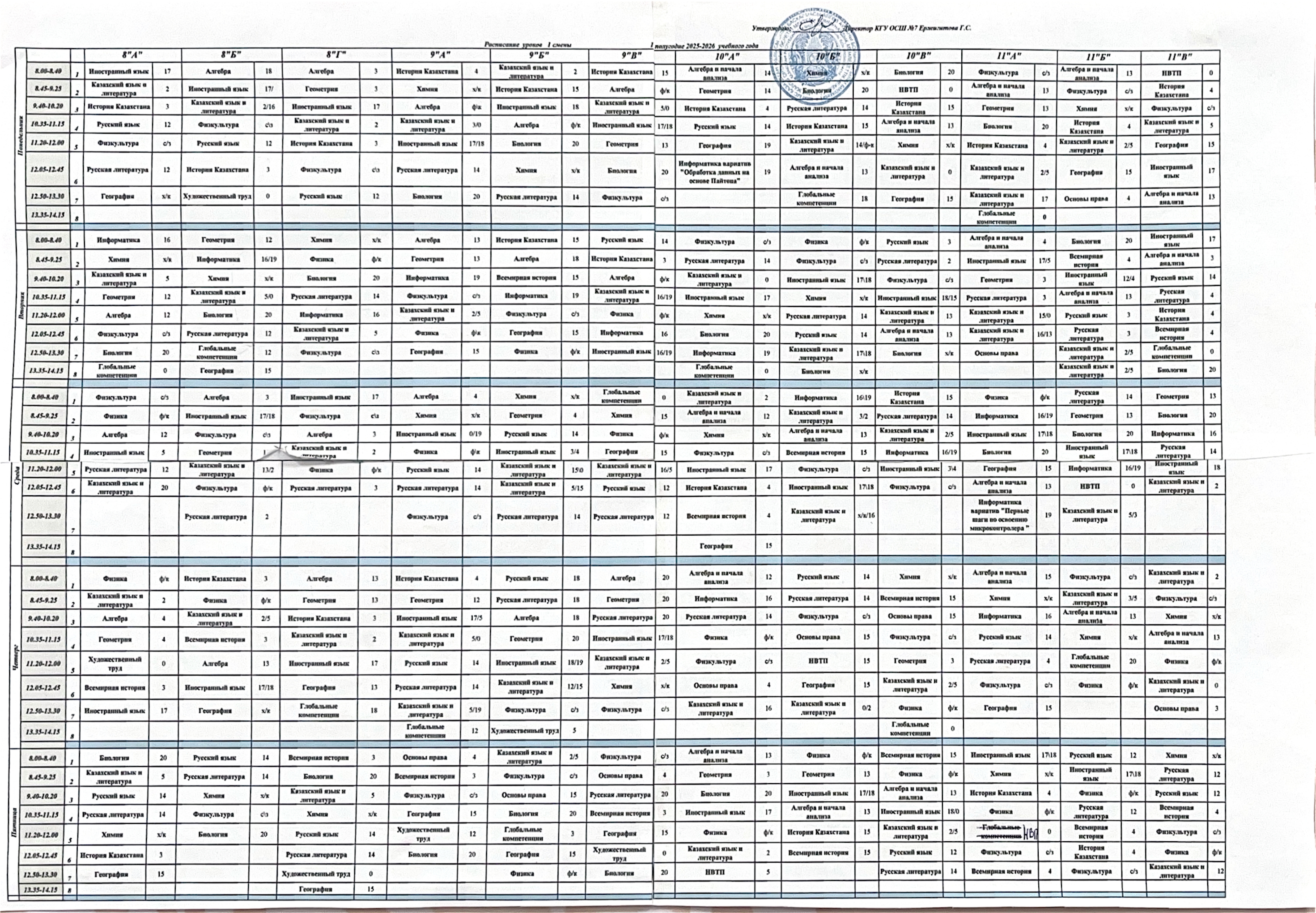 2025-2026 оқу жылының 1-ші жартыжылдығының 1-ші ауысымының сабақ кестесі